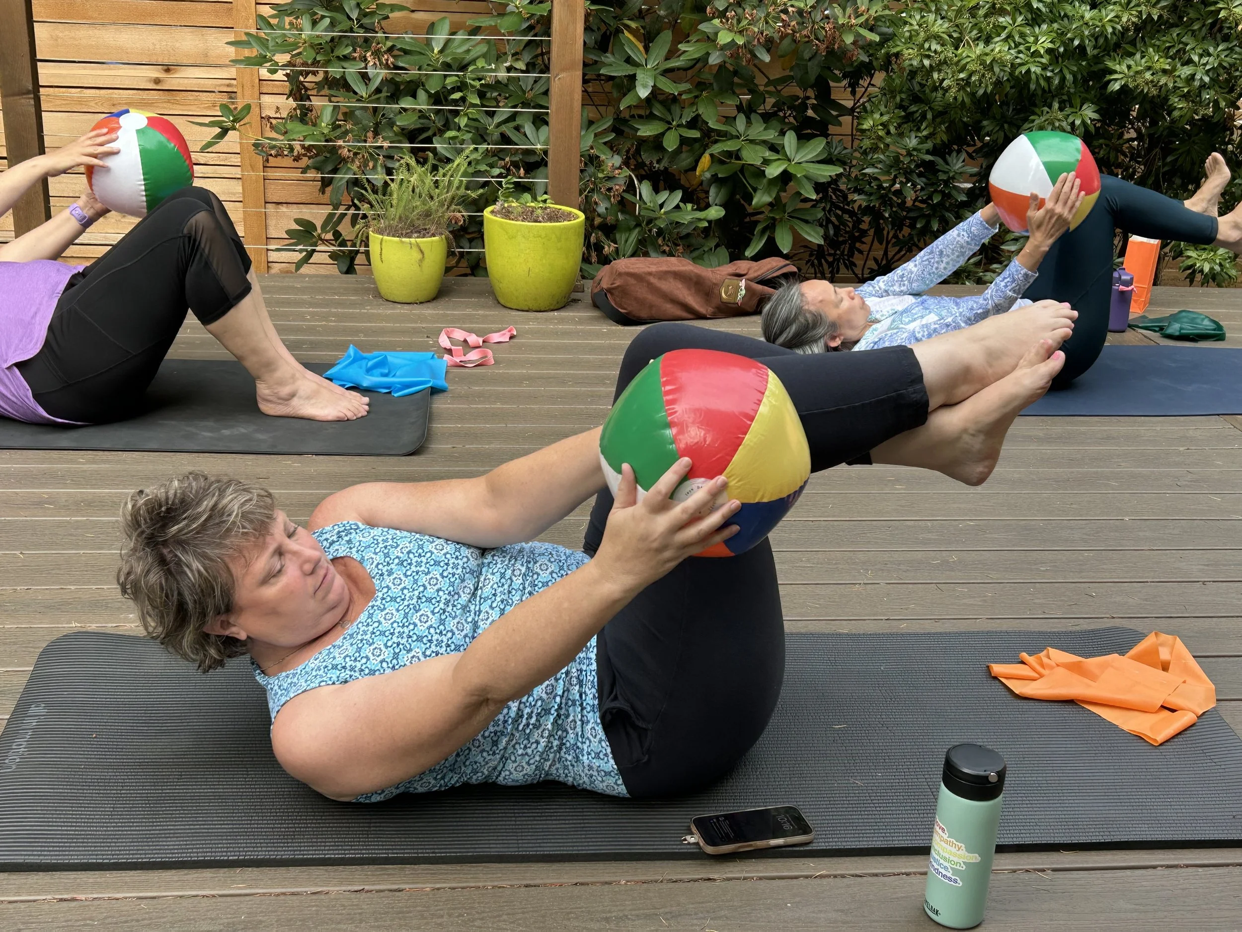 During class you’ll learn how to strengthen and stretch your body using packable props (bands, inflatable balls, and water bottles).